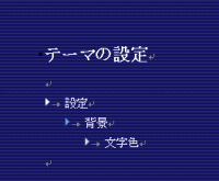 テーマを設定すると、背景や文字色が自動で変わります。 方法は簡単☆   初期設定では、このように入力されます。  メニューバー「書式」→「テーマ」を選択します。 すると・・・  テーマの設定ができるダイアログボックスが表示されました。  「テーマの選択」から、テーマを選びます。 今回は、「カスケード」を選択しました。 すると・・・   背景に青いボーダーが設定され、文字色も白に設定されました!  更にアウトラインの設定を加えると、 行頭の記号も自動で設定されているものが表示されます。 ↓この授業内容は?↓ マンツーマン授業「ここだけ教えて!」ワンポイントレッスン | |