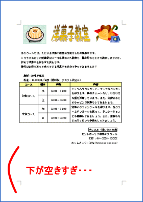 次の図のように、作った文書のバランスが悪い場合。  文字数と行数を調節すると、バランスのいい文書に仕上げることができます! 方法は簡単☆   メニューバー「ファイル」→「ページ設定」をクリックします。 すると・・・  ページの設定ができるダイアログボックスが表示されました。  ①「文字数と行数」のタブを選択します。 ②「文字数と行数を指定する」のボタンを選択します。 ③文字数を「32」にします。 ④行数を「30」にします。 ※今回は見本の文書に合わせた数値となっています。 文書によって、指定する文字数・行数は異なります。 すると・・・   全体的にバランスのいい文書になりました!! ※逆に行数が足りないという場合は、 同じくページ設定にて文字数・行数を増やすと解消できます。 その場合、文字数・行数には限度があるので気をつけましょう。 ↓この授業内容は?↓ 「ビジネスパソコンコース Word基礎」 | |