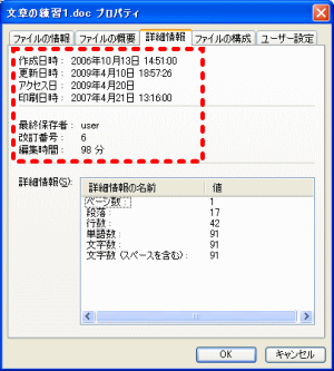 作成した文書の文字数をカウントすることができます! 方法は簡単☆   ①メニューバー「ツール」→②「文字カウント」 を選択します。 すると・・・  文字カウントのダイアログボックスが表示されます。  文字数だけでなく、ページ数や単語数、行数など細かくカウントされています。 実は、あともうひとつ文字数を表示できる画面があります!   ①メニューバー「ファイル」→②「プロパティ」 を選択します。 すると・・・   ここでは、文字数や行数、ページ数以外に、 作成日時や編集時間まで表示されます☆ ↓この授業内容は?↓ マンツーマン授業「ここだけ教えて!」ワンポイントレッスン | |