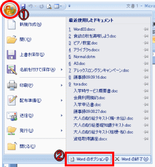 Office2007の配色は、青色のみ?  実は、他にも色を選べます。 青は見にくい!という方の為に、配色の変更方法をご紹介します☆   ①オフィスボタンをクリックします。 ②「Wordのオプション」ボタンをクリックします。 ※Excelなら「Excelのオプション」ボタン、 PowerPointなら「PowerPointのオプション」ボタンをクリックします。 すると・・・  Wordのオプションダイアログボックスが表示されました。  ③左のメニュー一覧が、「基本設定」になっていることを確認します。 もしなっていなければ、選択しておきましょう。 ④配色を、任意の色にします。 ※初期設定では「青」、その他「黒」「銀色」があります。 すると・・・   配色の変更が完了になります☆ ↓この授業内容は?↓ マンツーマン授業「ここだけ教えて!」ワンポイントレッスン | |