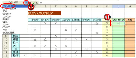 次の表で、遅刻・早退、欠席回数を数えましょう! ※△が遅刻・早退、×が欠席となります。  関数「COUNTIF」とは、条件に合ったセルを数える関数です。   ①遅刻・早退回数を表示させたいセルに「=」を入力します。 ②関数の一覧の中から、「COUNTIF」を選択します。 すると・・・  関数の引数ダイアログボックスが表示されます。  範囲に、【C5:J5】と入力します。 検索条件に、【△】 ※この場合、数える対象になる範囲を選択しなければいけないので、 範囲は【C5:J5】となり、検索条件は遅刻早退を示す【△】となる。 すると・・・  遅刻・早退回数が表示されました!   図のように、アクティブセルの右下をドラッグすると・・・  オートフィル機能により、すべて求まります!  欠席回数も、同じように求めることができます。  これで指定した条件に合ったセルを数えることができます☆ ↓この授業の内容は?↓ マンツーマン授業「ここだけ教えて!」ワンポイントレッスン | |